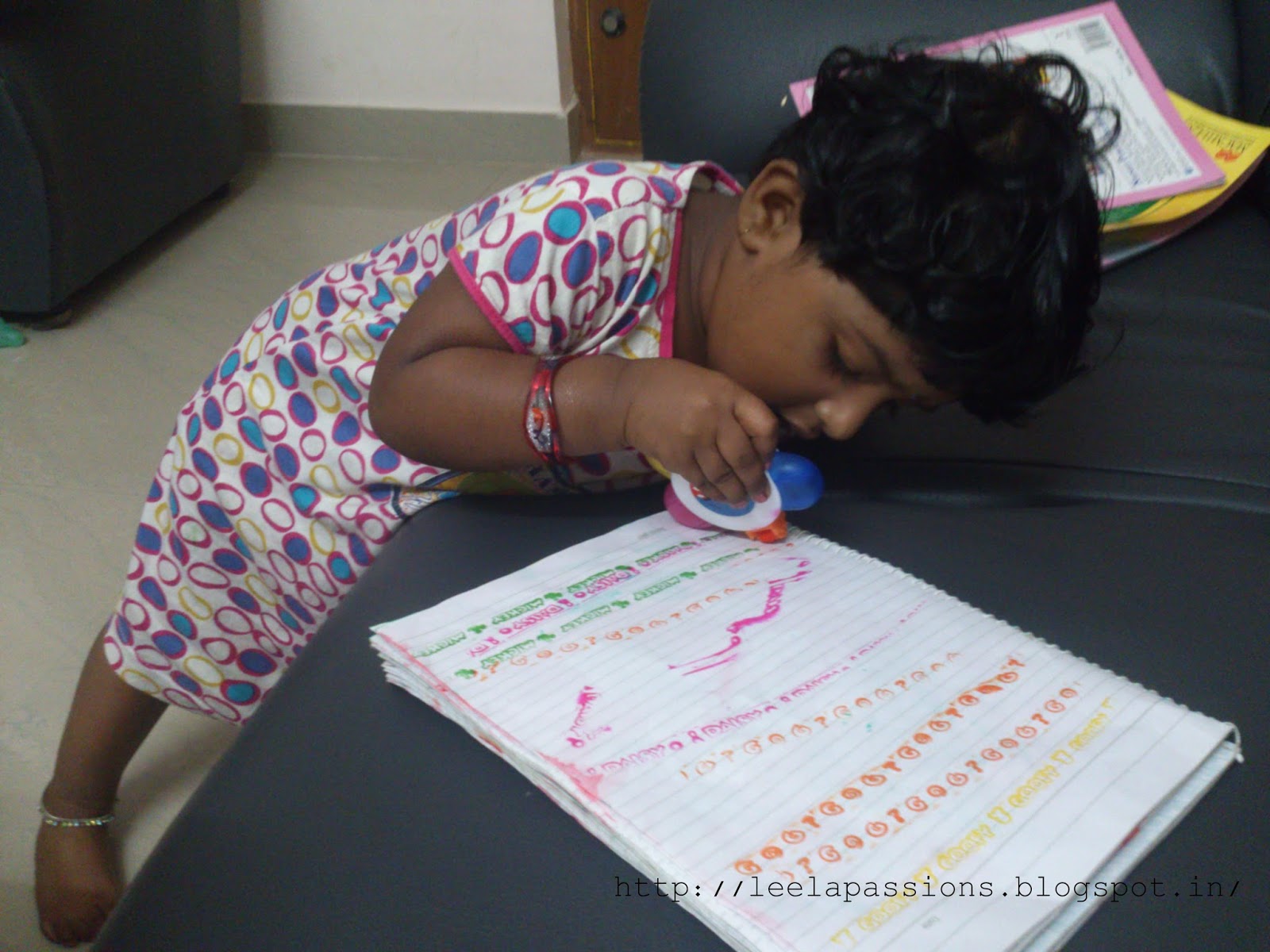She tried to identify letters and colors that are created when you roll the stamp on the paper. But Medha creates lot of mess whenever I give painting or stamps or color sketch pens etc. by rubbing to hand and dress etc. So I used to take at most care of dressing her up in old clothes or night dresses. She wanted to explore all those colors and patterns on her own hand, of course kids are like that. :)